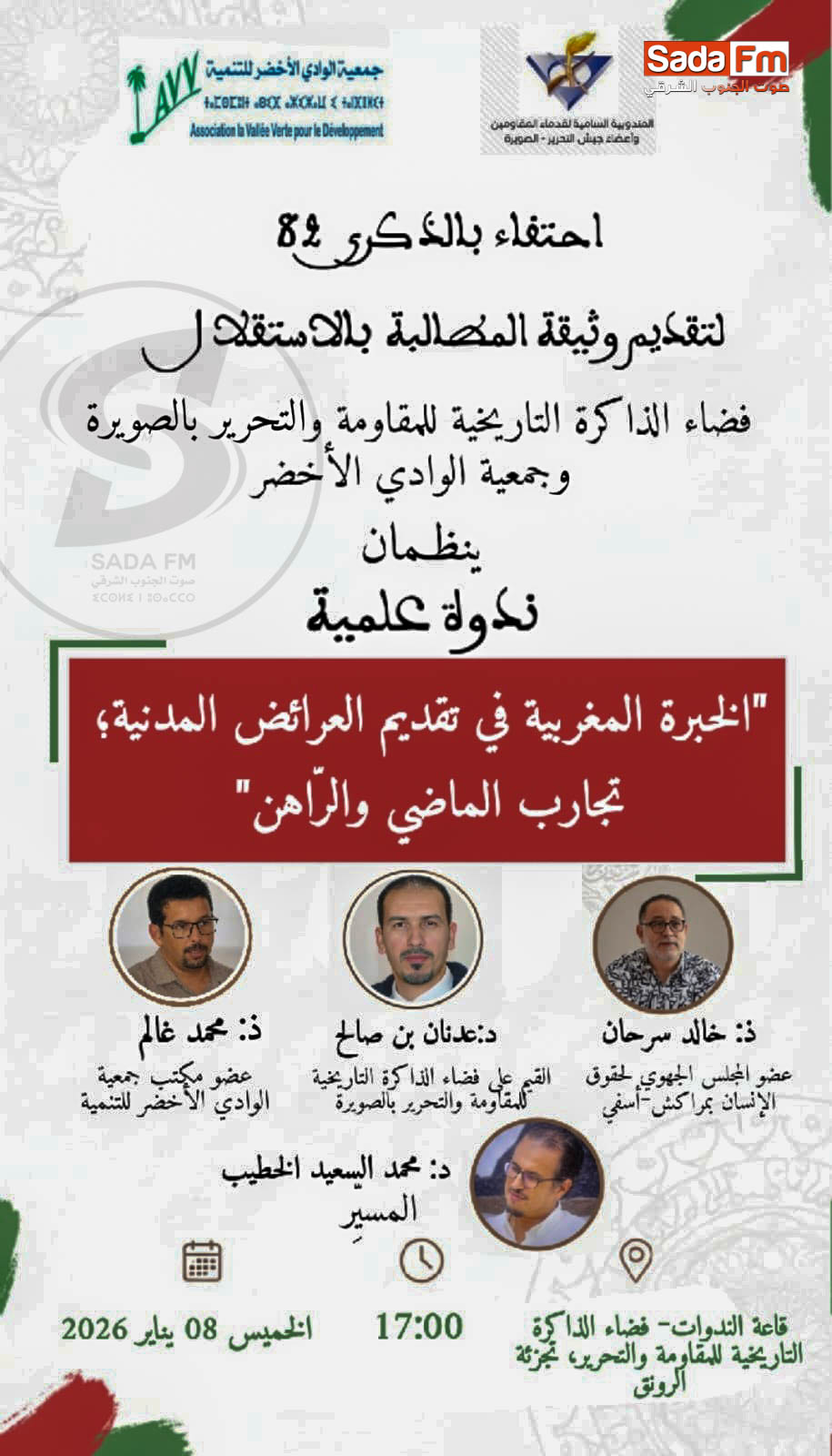 في اطار الشراكة بين جمعية الوادي الاخضر للتنمية والمجلس الجهوي لحقوق الانسان بمراكش اسفي وفضاء الذاكرة التاريخية للمقاومة والتحرير بالصويرة، احتضنت قاعة الندوات التابعة لهذا الاخير ندوة علمية في موضوع “الخبرة المغربية في تقديم العرائض المدنية؛ تجارب الماضي والراهن”، وذلك مساء الخميس 8 يناير 2026، تخليدا للذكرى 82 لتقديم وثيقة المطالبة بالاستقلال.