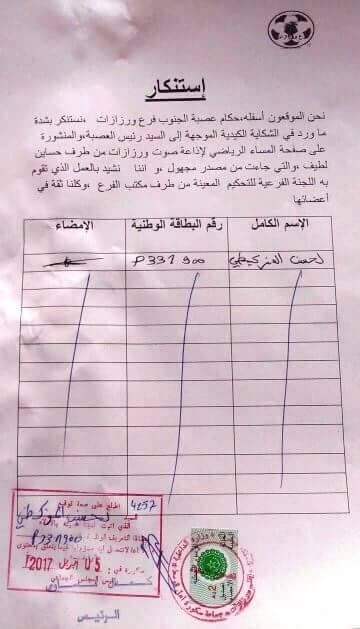 كرة القدم فرع ورزازات “، يشجبون فيه ما جاء في هذه الشكاية المنشورة بالصفحة
