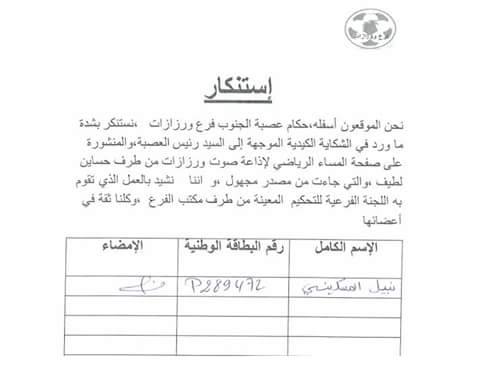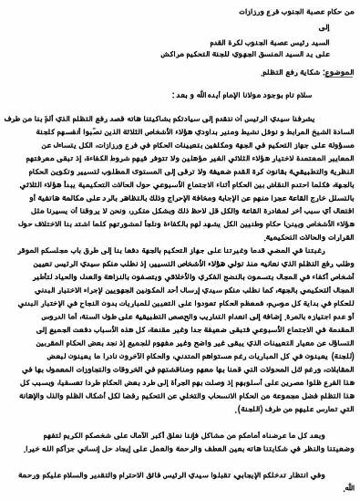 والوطني، نحتفظ بنسخة منه ، ردا على شكاية موجهة الي السيد رئيس عصبة الجنوب لكرة