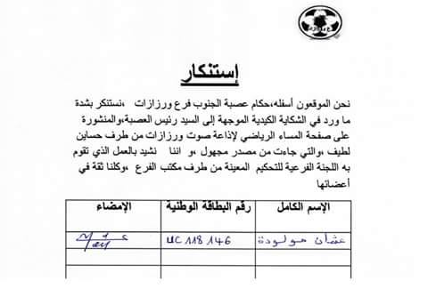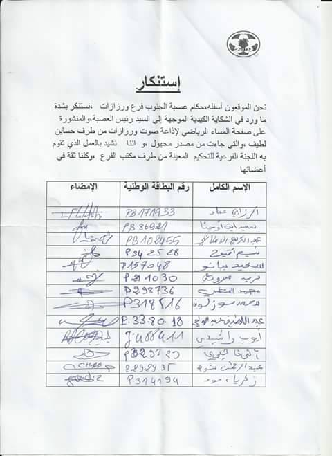 ” استنكار”عنوان بيان حقيقة لحكام عصبة الجنوب لكرة القدم فرع ورزازات ردا على شكاية موجهة الي السيد رئيس العصبة .