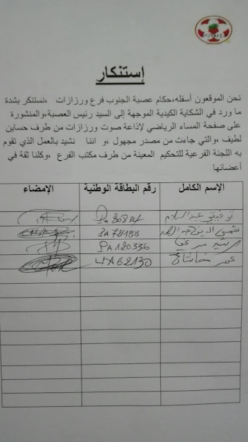 التحكيم بالعصبة ،موقع من طرف هؤلاء الحكام و موجه إلى الرأي العام المحلي، الجهوي