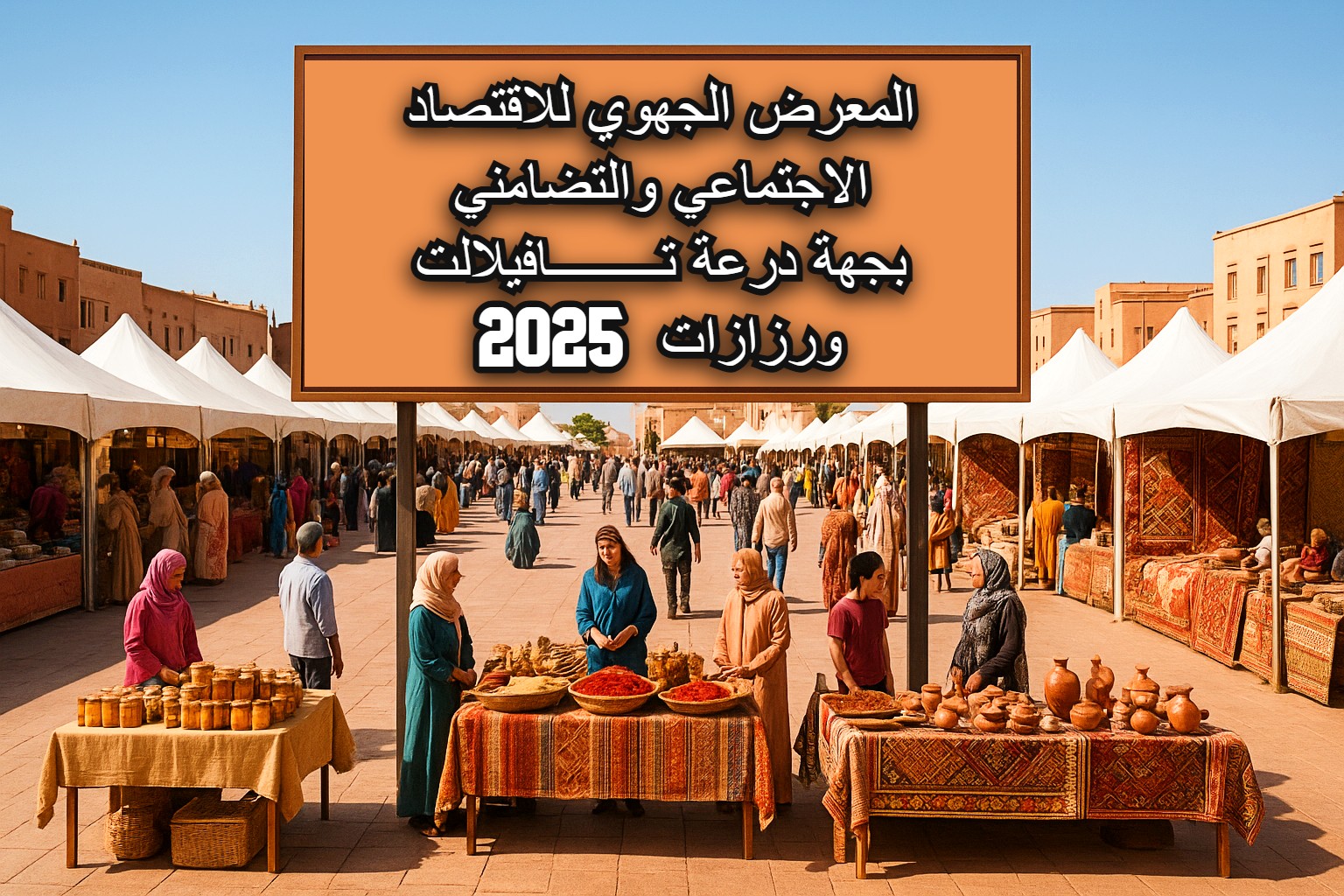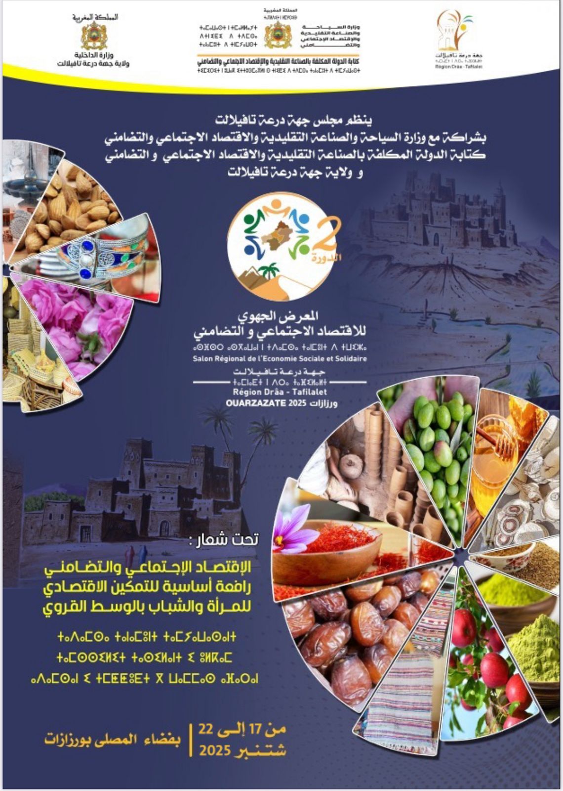 ينظم مجلس جهة درعة تافيلالت الدورة الثانية للمعرض الجهوي للاقتصاد الاجتماعي والتضامني بجهة درعة تافيلالت، وذلك خلال الفترة ما بين 17 و22 شتنبر 2025 بمدينة ورزازات بفضاء المصلى، تحت شعار: